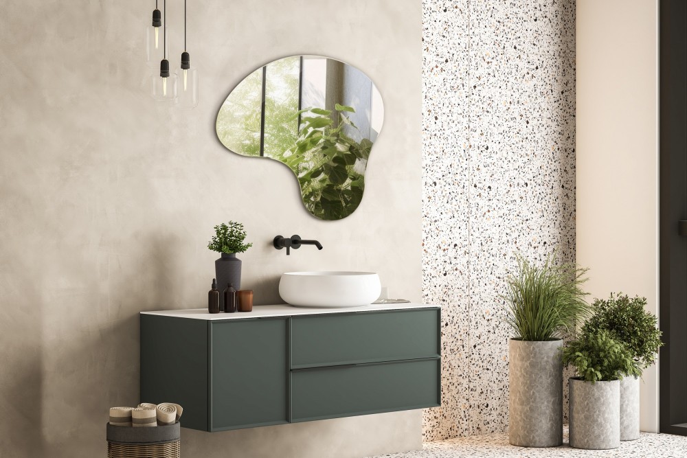 Se busca um efeito ousado, o espelho do banheiro pode ter também um formato incomum - por exemplo, assimétrico ou orgânico, que pode dar ao espaço um visual excepcional e de design.