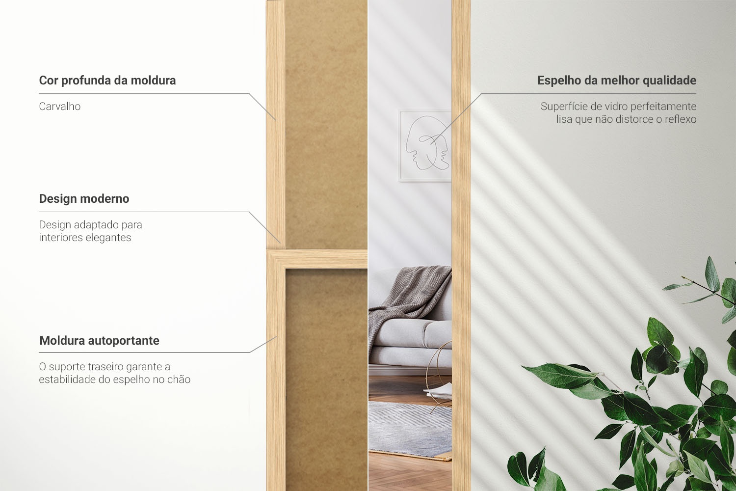 O espelho de pé em cor de carvalho adapta-se facilmente a diferentes ambientes e estilos de decoração, incluindo espaços com detalhes em carvalho e materiais naturais. Fabricado na Polónia, chega até si como um produto pronto, pensado para quem valoriza praticidade sem abrir mão da estética. A película protetora na parte traseira pode variar de cor em relação às imagens, mas isso não altera a qualidade nem o encanto do seu novo espelho de corpo inteiro, nem constitui motivo para reclamação.