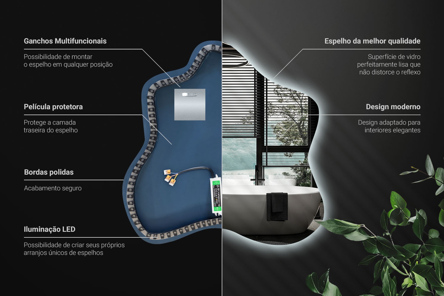 Atreva-se a ser diferente. Escolha o nosso espelho em forma de mancha com LED e dê aos seus interiores a combinação perfeita de design, elegância e luz.